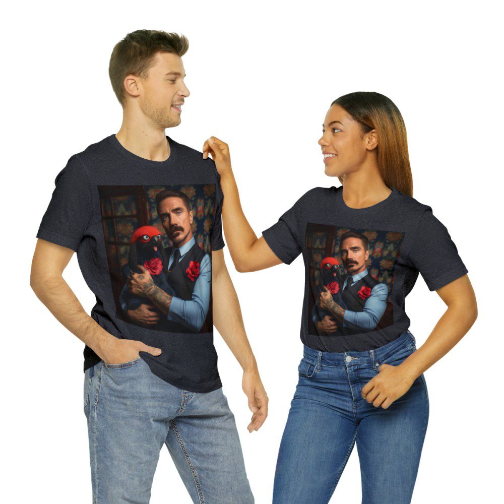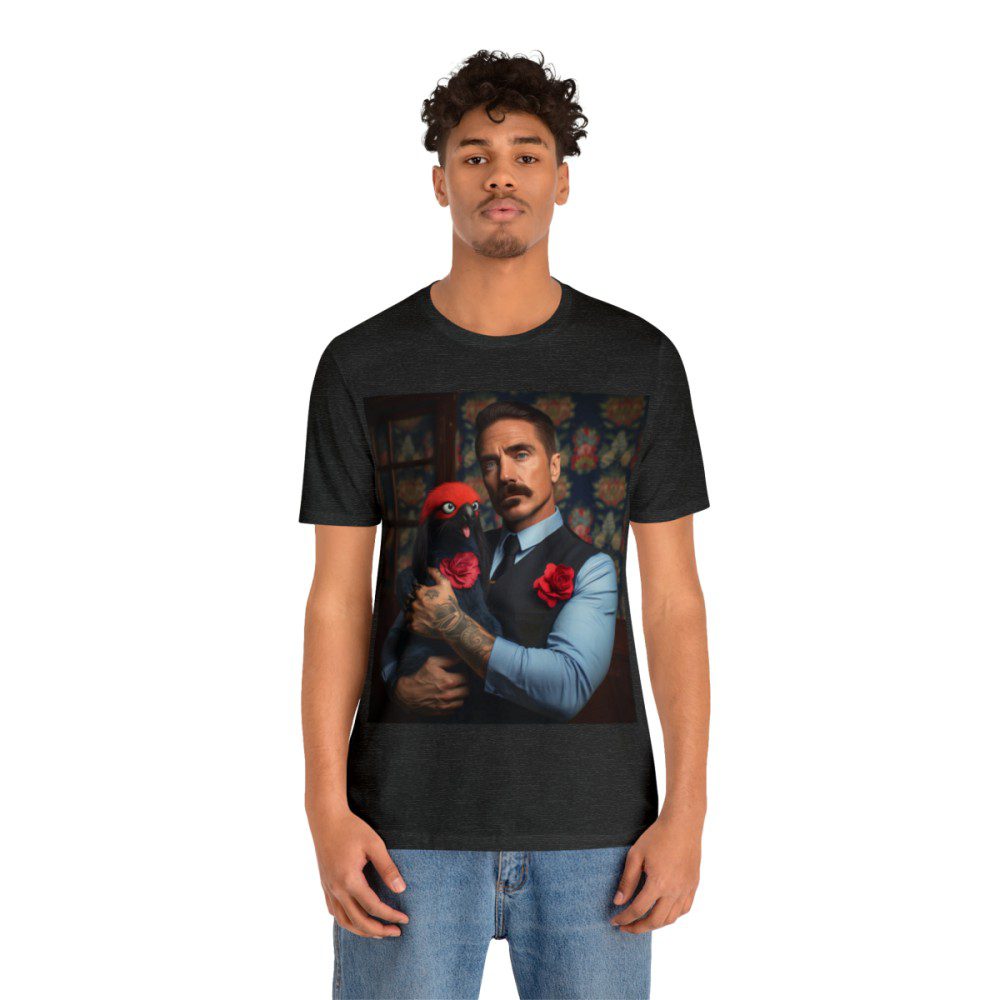 Known for his unrivaled charm and meticulous attention to detail, Amauris, the world renowned puppeteer, is shown in this captivating portrait. With his expressive “parrot sloth dog” puppet playfully perched on his hand, Amauris’s eclectic style and storytelling prowess are obvious. Amauris doesn’t exist, of course, but people will definitely be asking about who’s on your shirt. — Feel free to make up a story about the greatest show you saw in Vegas!