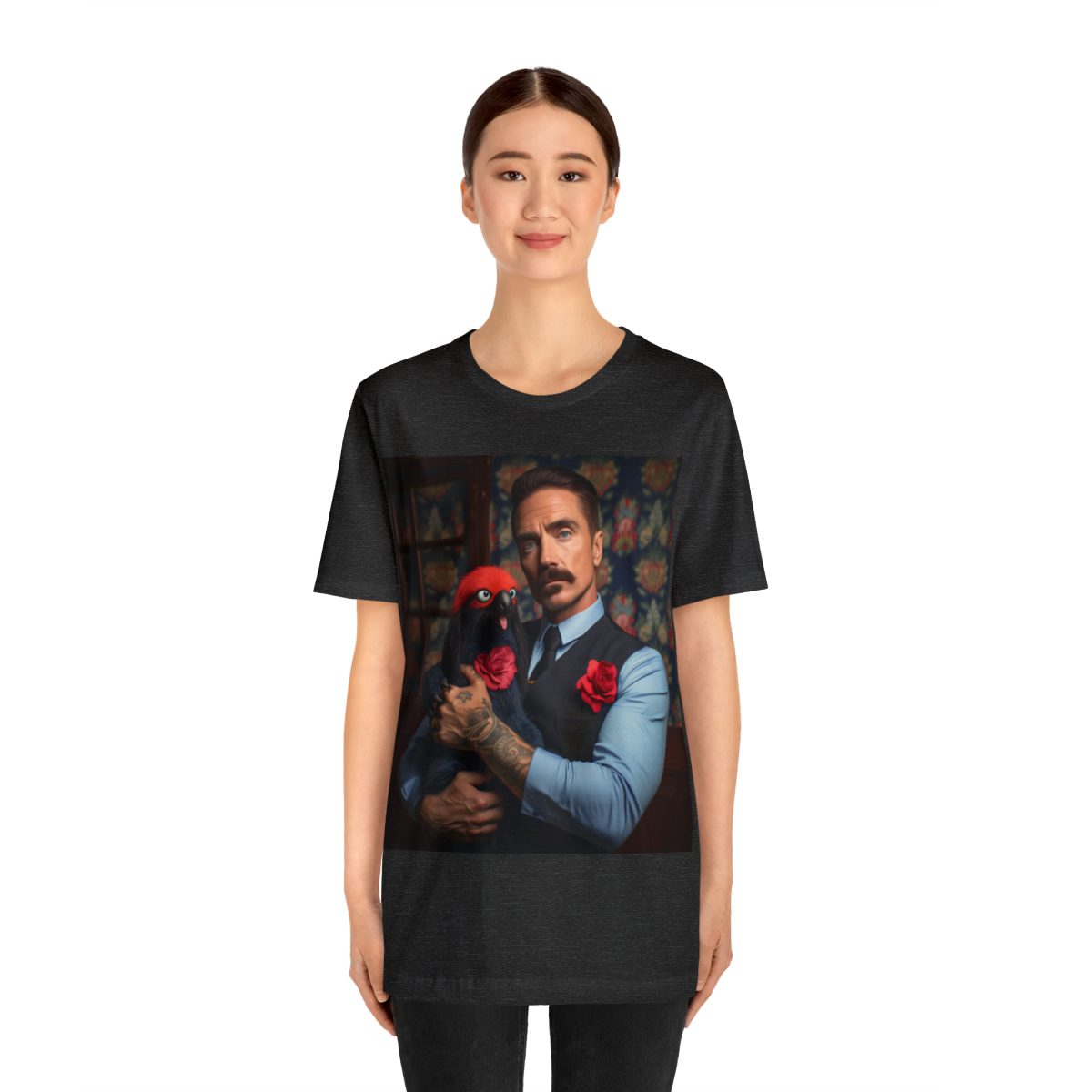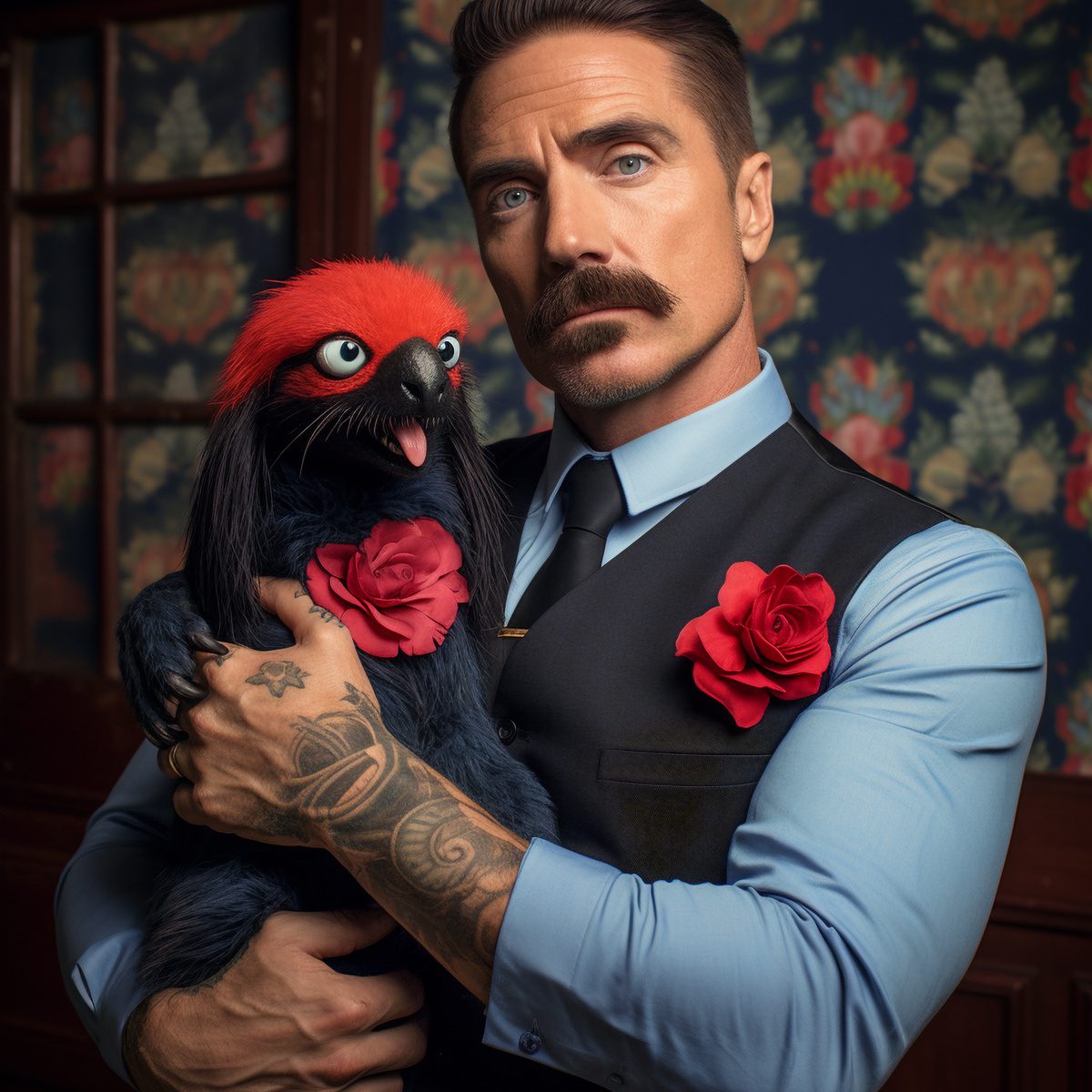 Known for his unrivaled charm and meticulous attention to detail, Amauris, the world renowned puppeteer, is shown in this captivating portrait. With his expressive “parrot sloth dog” puppet playfully perched on his hand, Amauris’s eclectic style and storytelling prowess are obvious. Amauris doesn’t exist, of course, but people will definitely be asking about who’s on your shirt. — Feel free to make up a story about the greatest show you saw in Vegas!