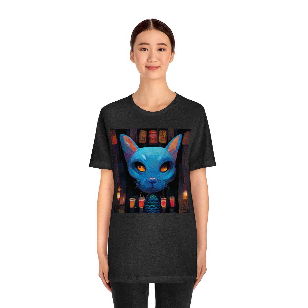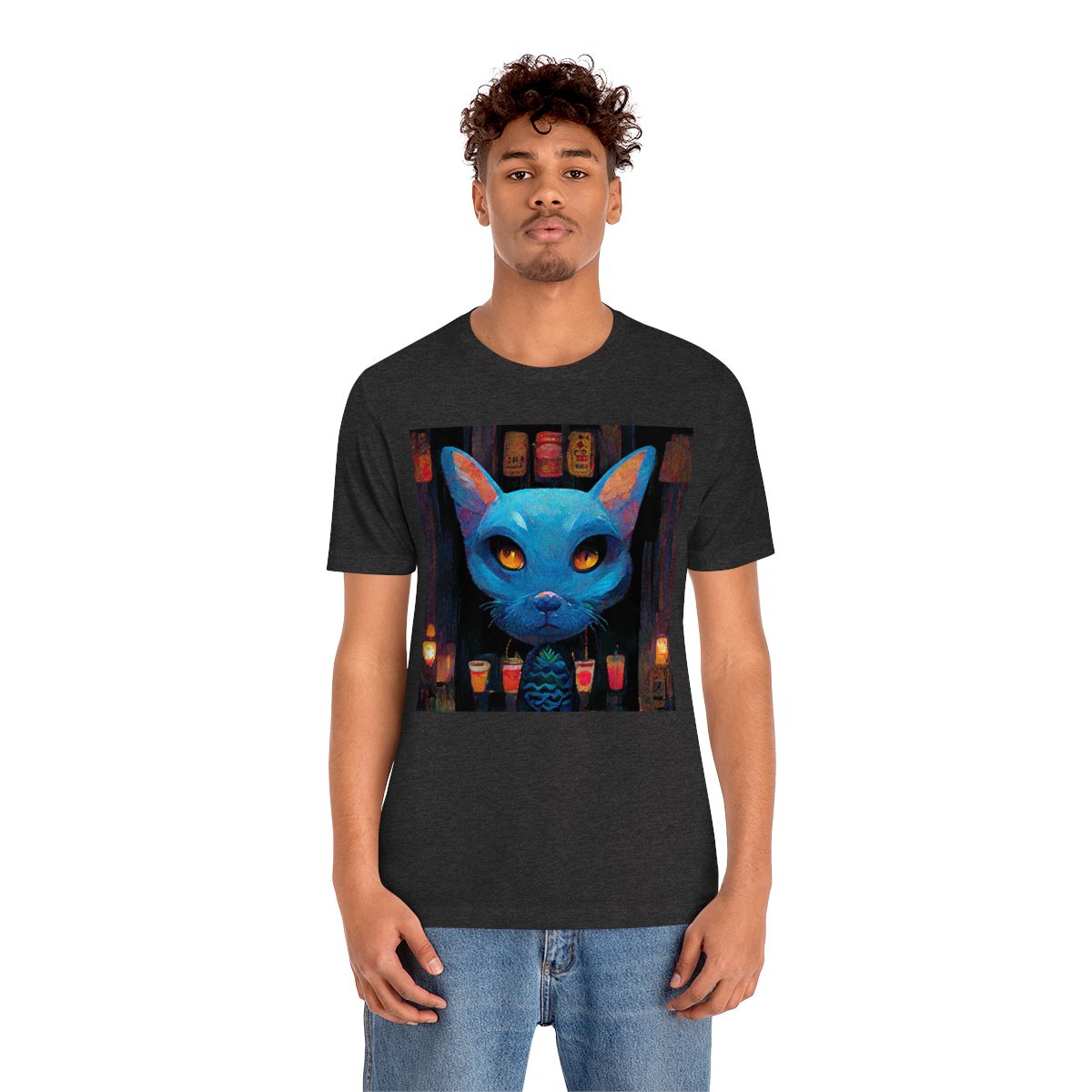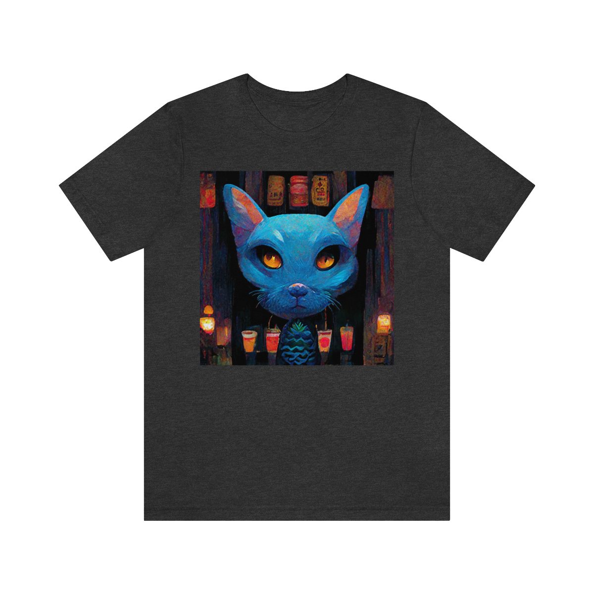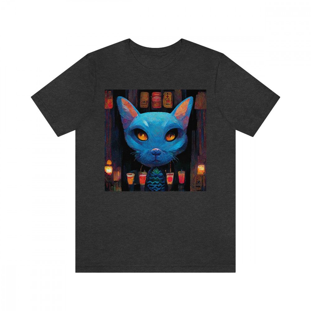 Blue Mysterious Cat With Large Head Sits In Dimly Lit Tiki Bar