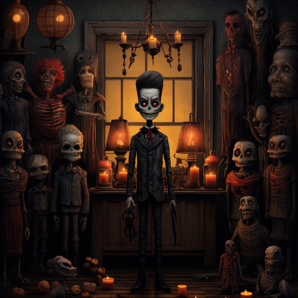 Stepping into the realm of the mysterious, this Norma Geli spooky design invites you into a dimly lit room where a skeletal soirée is in seemingly in full swing. Amidst the bony crowd, one dapper skeleton, suited up and ready to party, stands staring at you. But wait, is that a candlelit dance party or a macabre meeting?