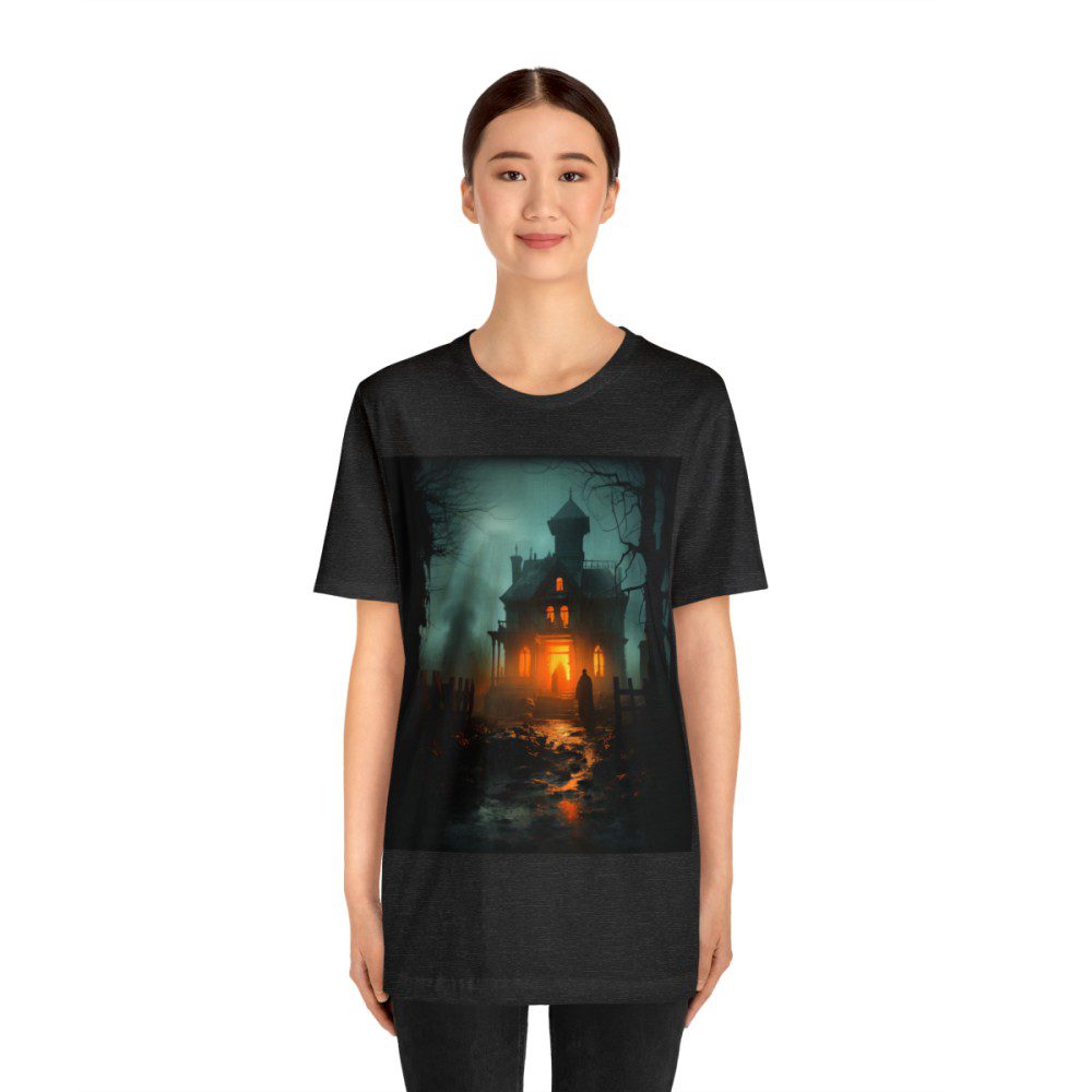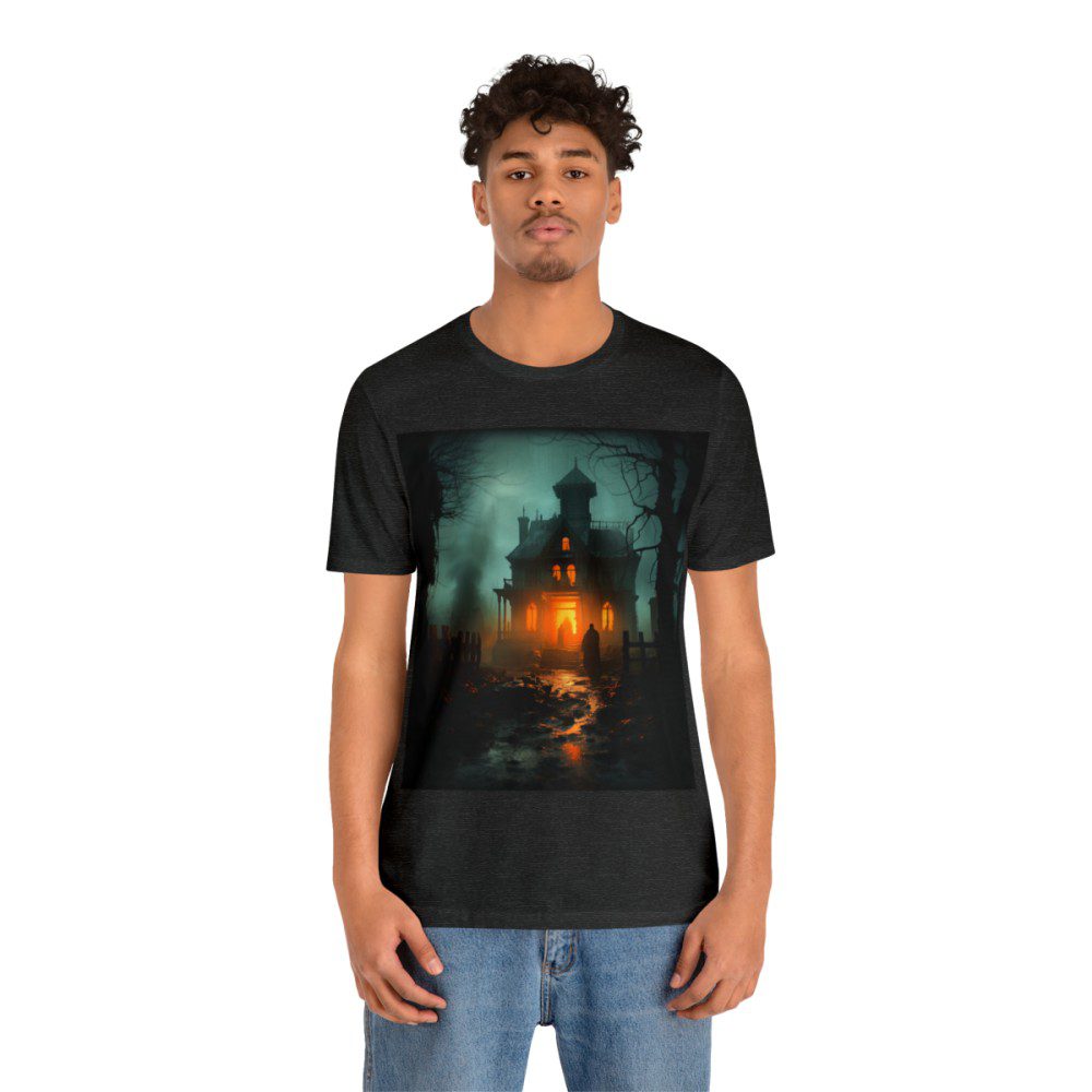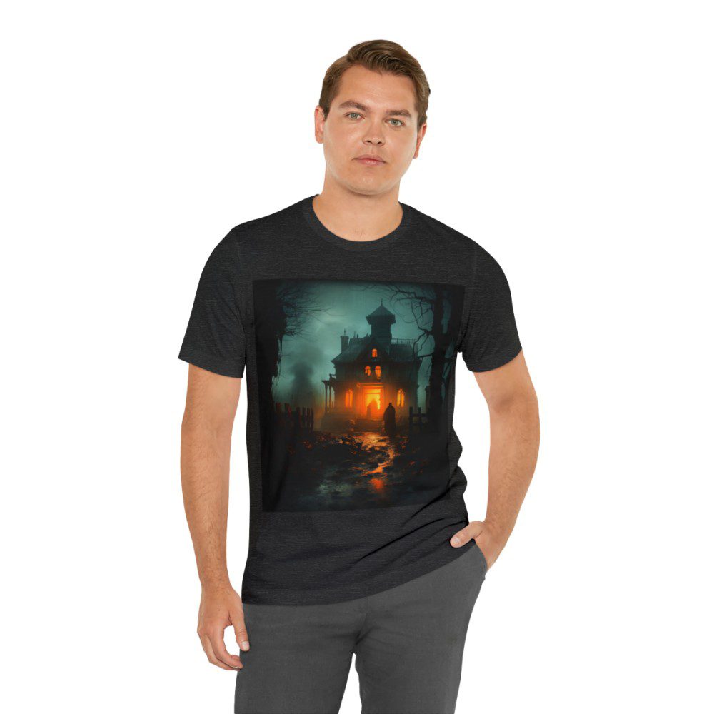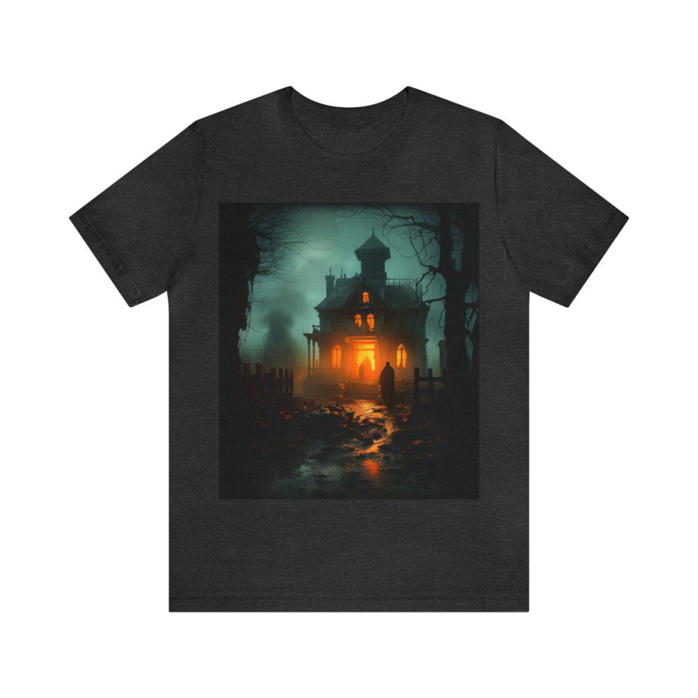 A haunting house stands tall; its timeworn facade echoing tales of yesteryears as a bright orange glow comes from within. In the foreground, a cloaked figure, shrouded in mystery, stands resolute, his intentions unknown. The scene is punctuated by a smaller figure at the home’s entrance and smoke billowing in the distance, hinting at secrets yet to be unveiled.