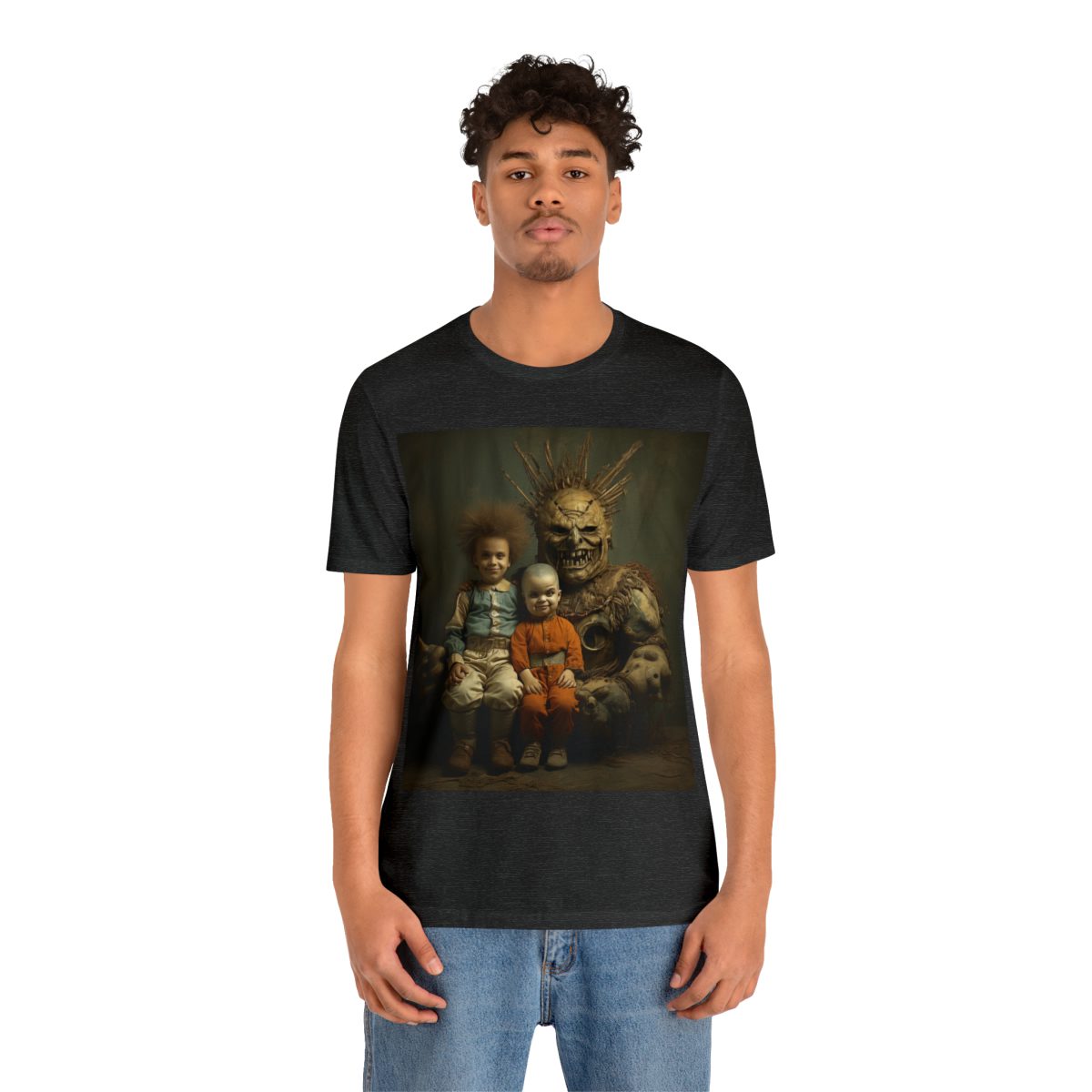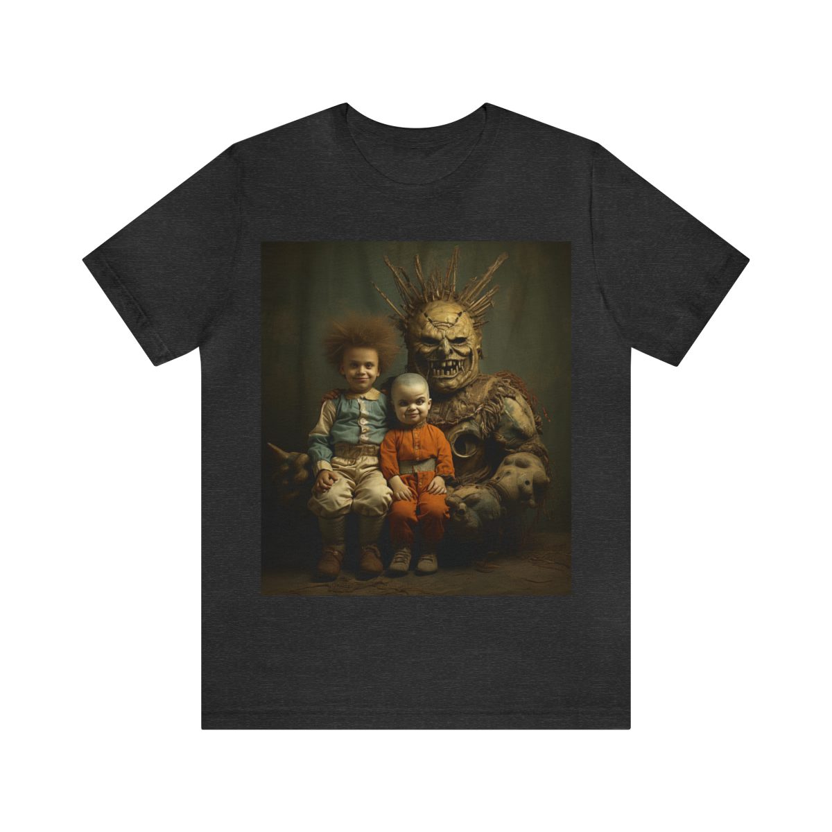 Most Norma Geli shirts are designed to pique your curiousity and to leave you with a few questions. This one takes the cake as you’ll be wondering everything from “What’s going on?” to “Is that a little person?” to “Is that a statue? A statue of what?” to “What country is this in?” to “When was this?” to “Is that a chair?” and on and on. — The questions could go on all night!
