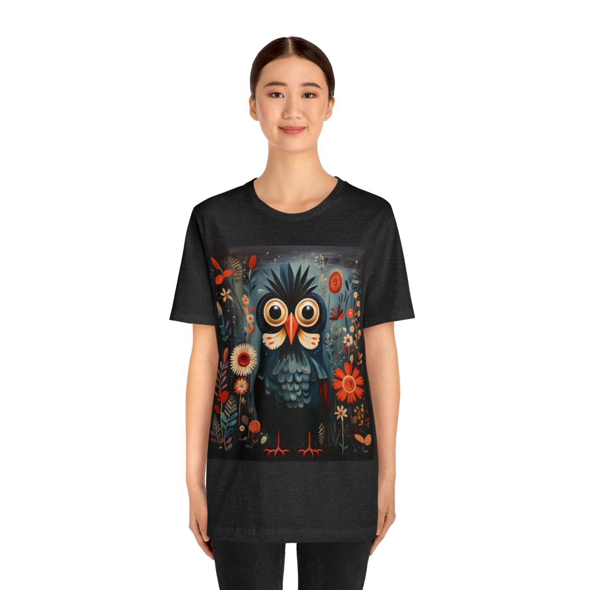 With hues reminiscent of autumn and the enchanting allure of twilight, a majestic owl stands as the sentinel amidst a field of flowers. The owl, with its deep, soulful eyes, acts as a magnetic centerpiece of this tableau, drawing you into the very essence of its mystical realm.