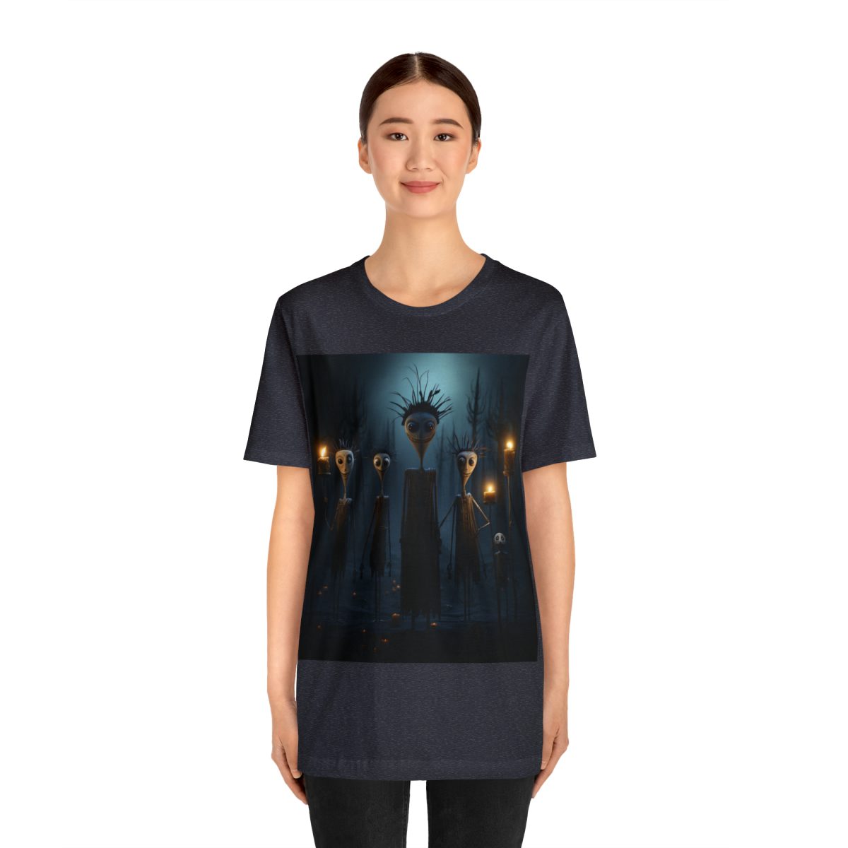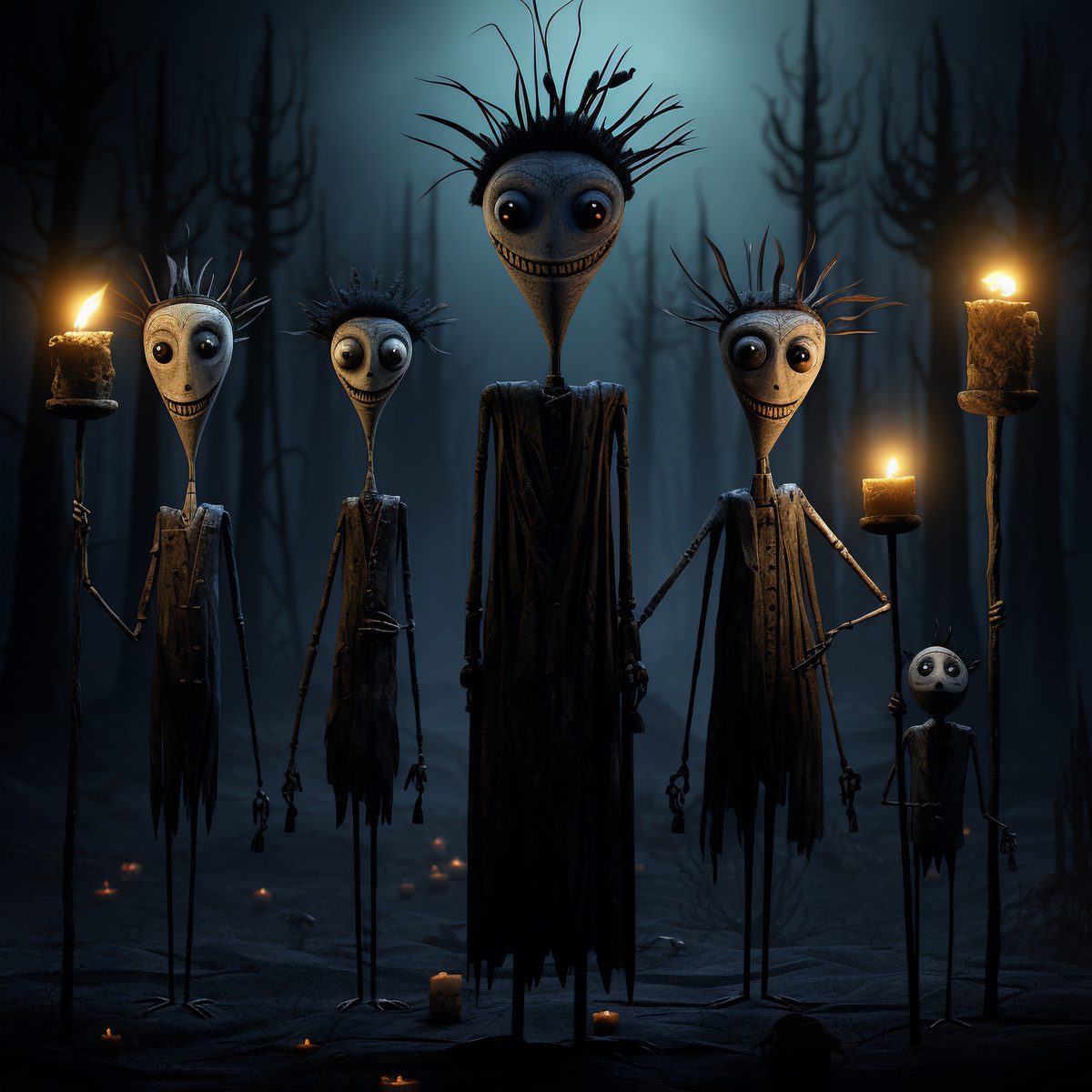 Wild hair, bulbous heads, wide eyes, and grinning faces. This family of super skinny teardrop heads is ready to head out on the town for a night of spooky revelry!