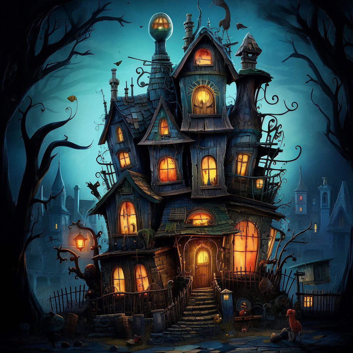 Dive into a moonlit mystery with this scary-but-cute haunted house of childhood stories. Bathed in the ghostly glow of the full moon, it, no doubt, holds whispered tales behind its creaking doors, ramshackle construction, and glowing fire-tint windows. — Perhaps a long forgotten child’s “scary” story is a worthwhile read tonight?
