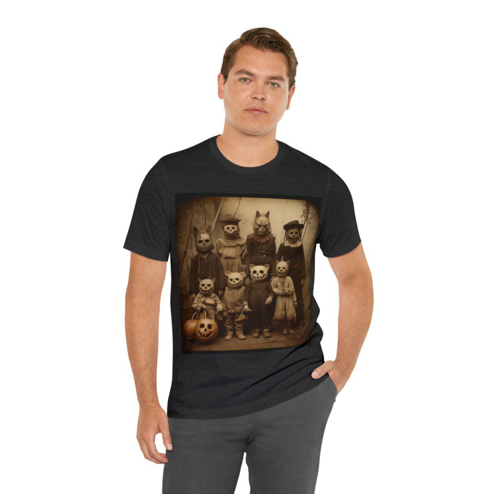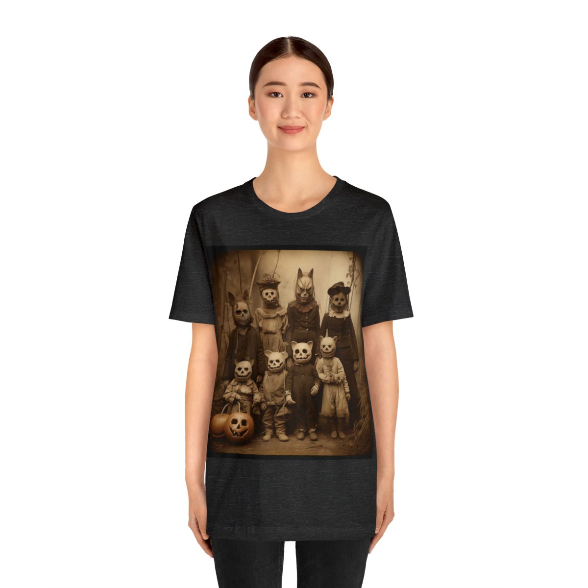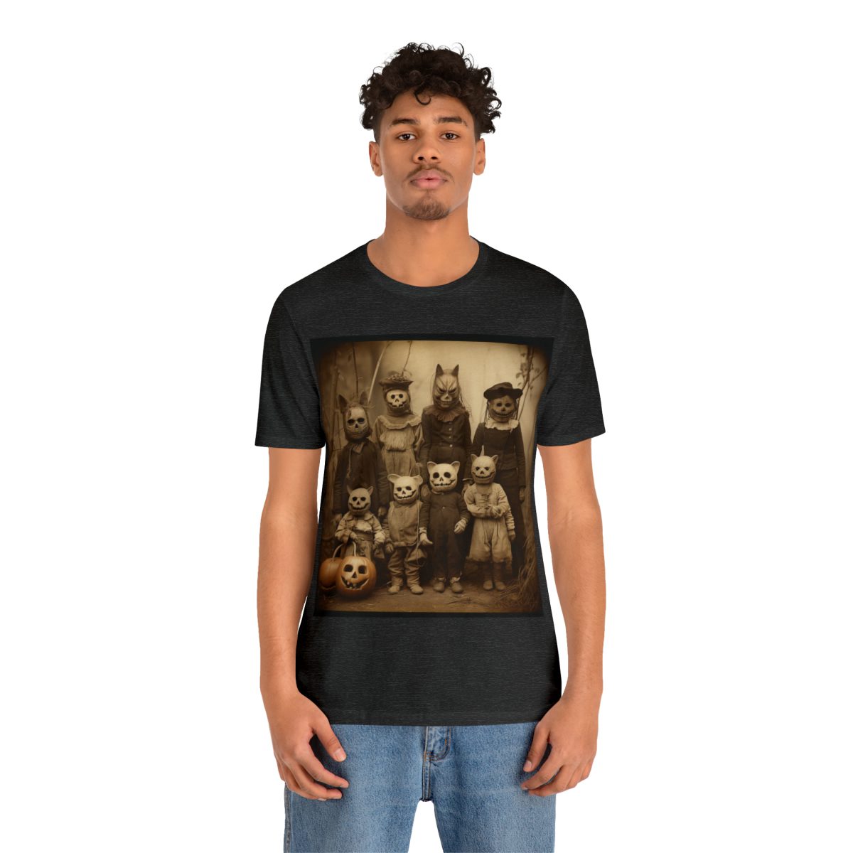 Step right into the heart of Halloween town with vintage photo of family of trick-or-treaters! Are they children from a century ago? Are they decorative dolls? Is that a creepy AF nanny in the back? Wear this shirt and scare the begeezus out of kids near and far! With this tee, every day can be a Halloween masquerade!
