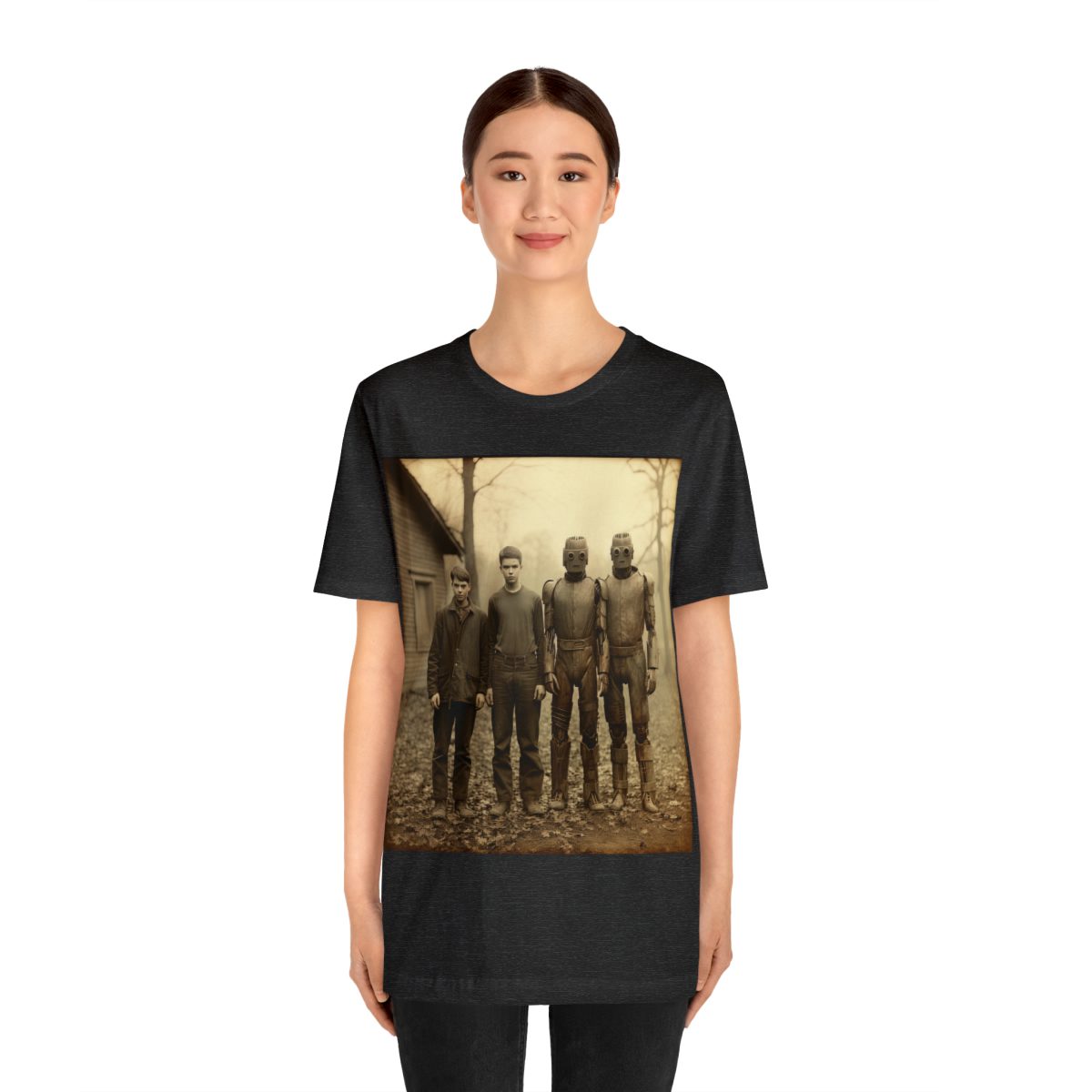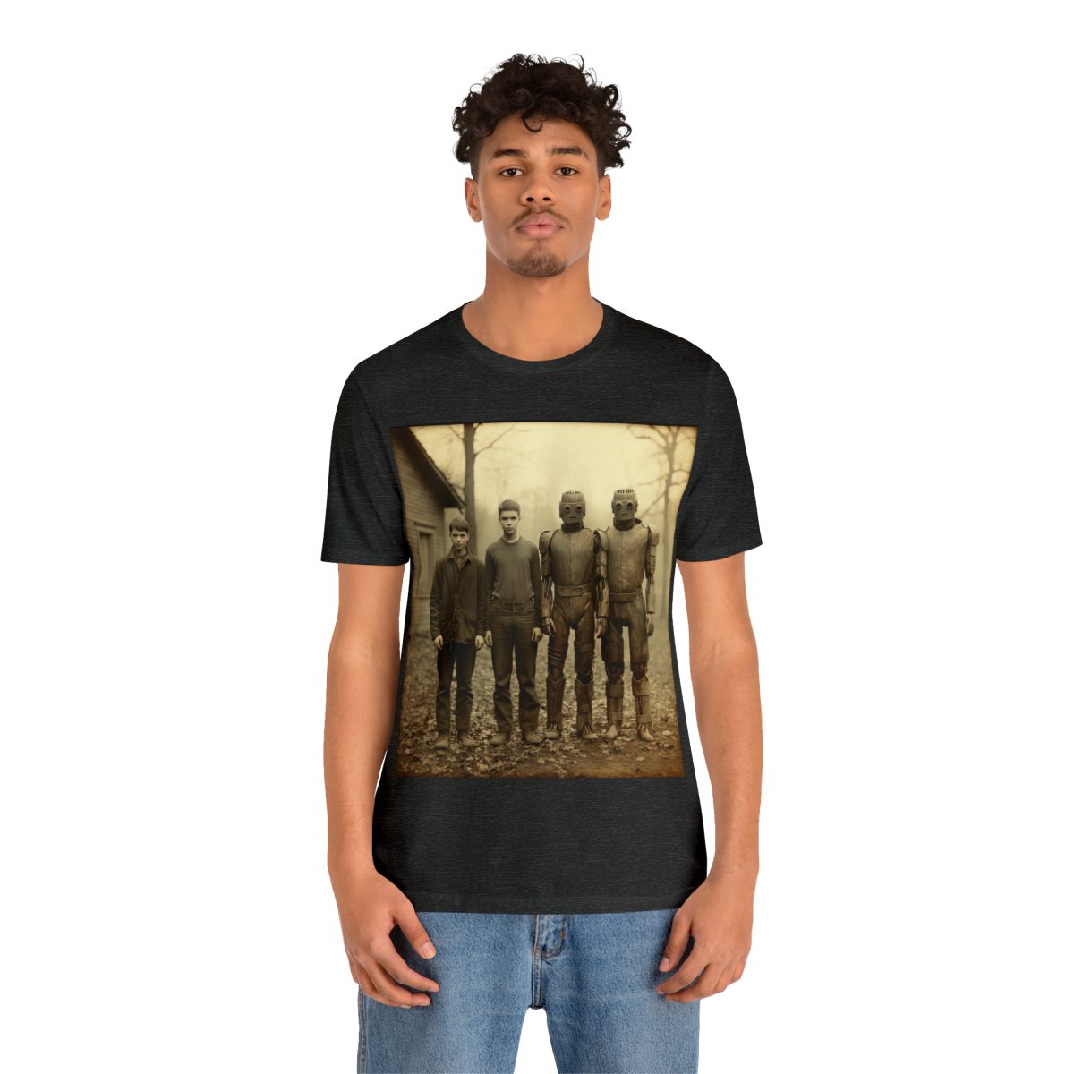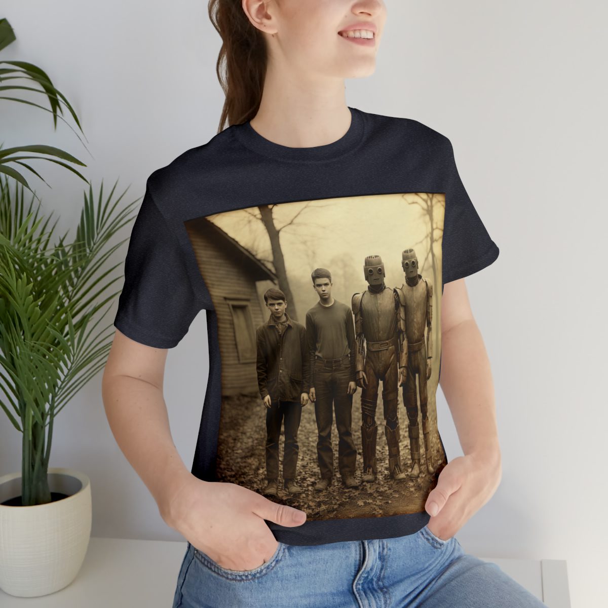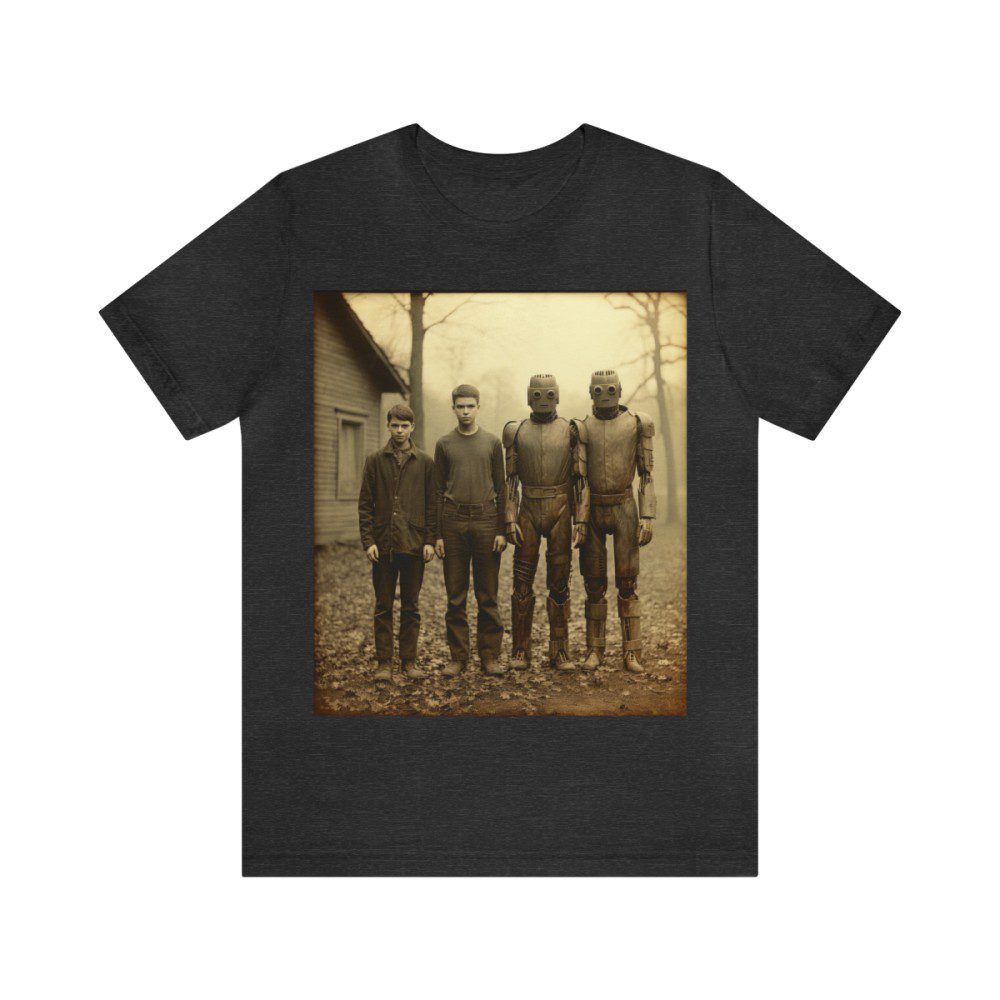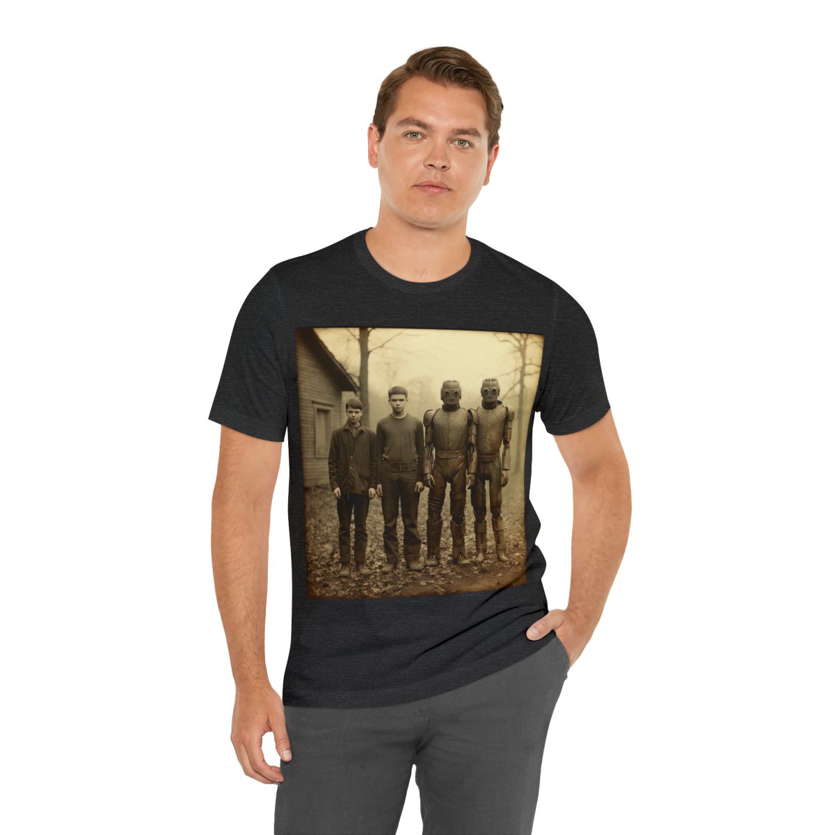 Halloween costumes or an invasion from a distant planet? We don’t know, and the truth is likely lost to the past, as two young men stand next to two thin, humanoid shapes with rudimentary faces in this vintage photo. We do know the invasion wasn’t an annihilation, though, as we’re still here! — Spread the curiosity this design inspires by wearing this shirt wherever you go!