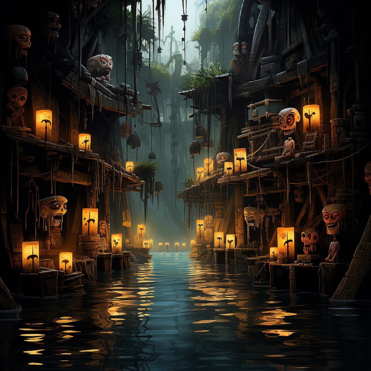 Venture into a city where the mystical intertwines with the everyday! Amidst the darkened streets, lanterns cast ethereal reflections on the water, setting the stage for a hauntingly beautiful urban scene. But look closer: skeletons roam, a masked figure lurks, and a haunting tune fills the air and echoes through the night. With this shirt, you’re not just wearing a t-shirt; you’re sharing a world of stories, each corner holding a secret waiting to be unraveled.