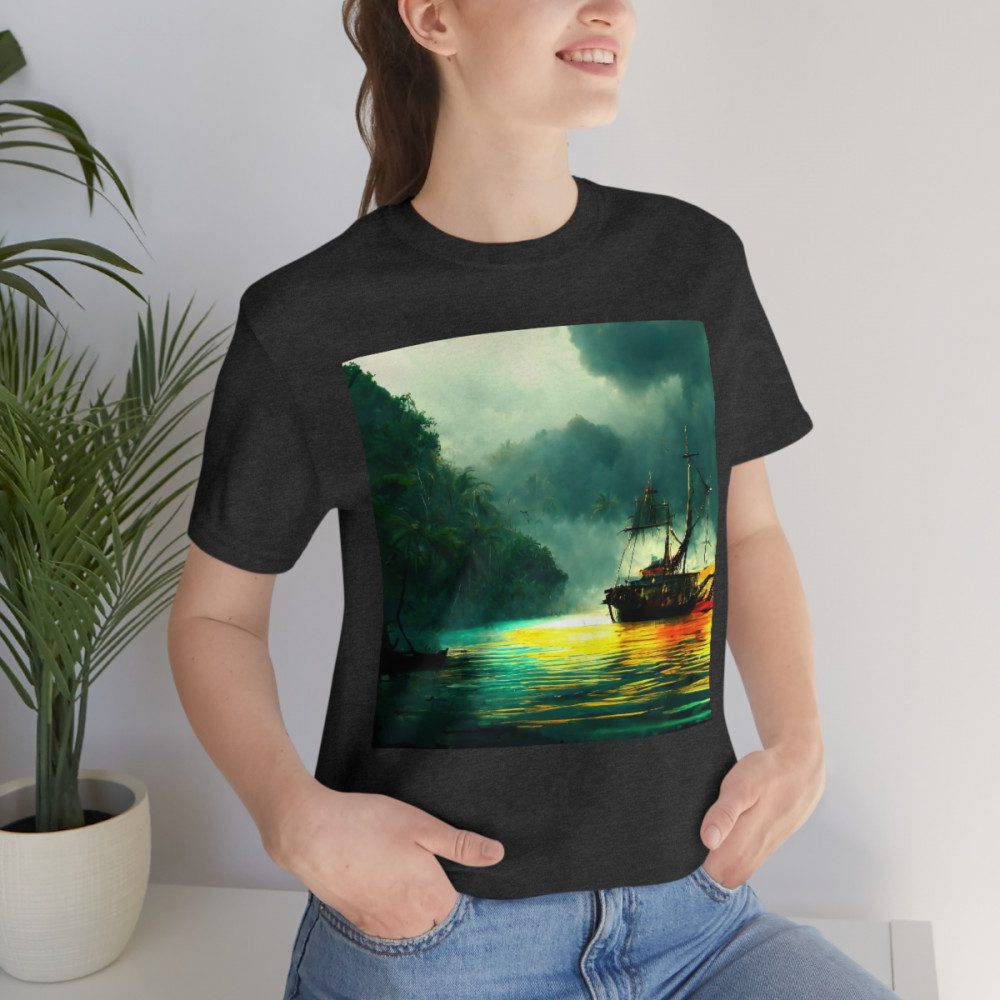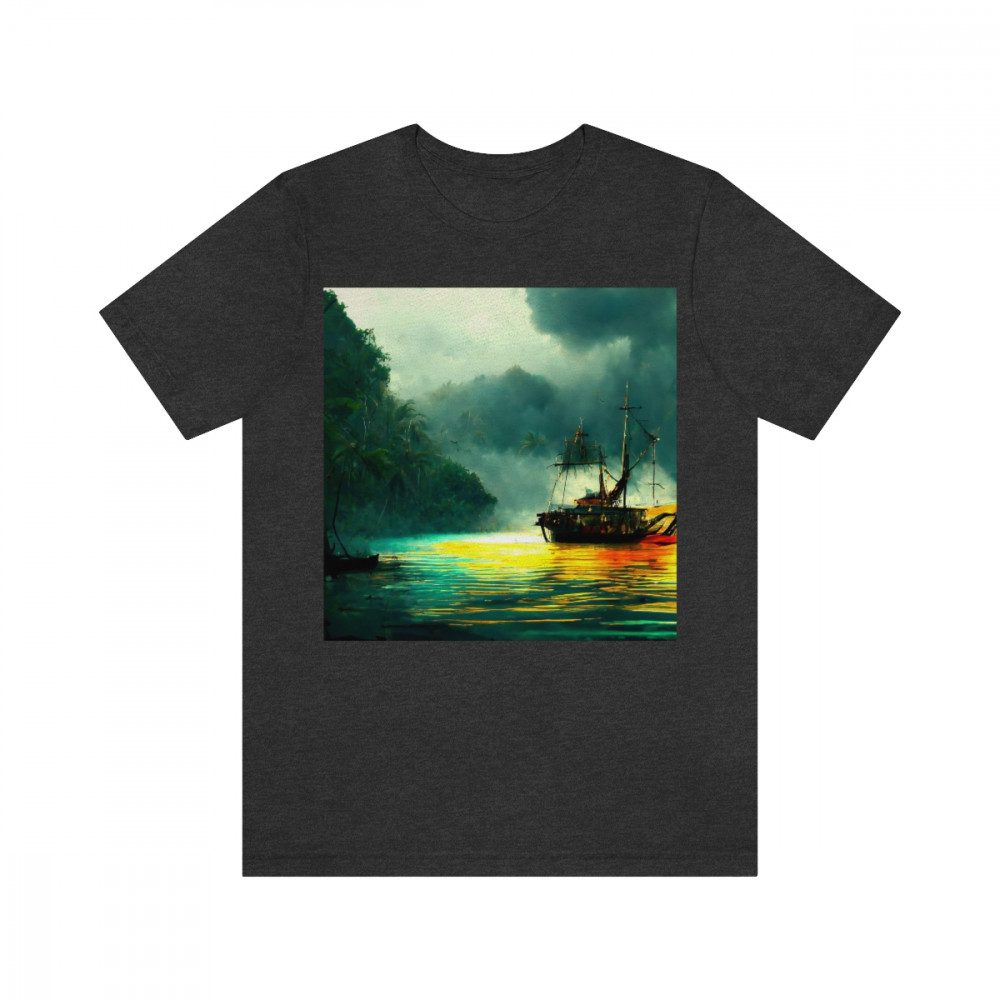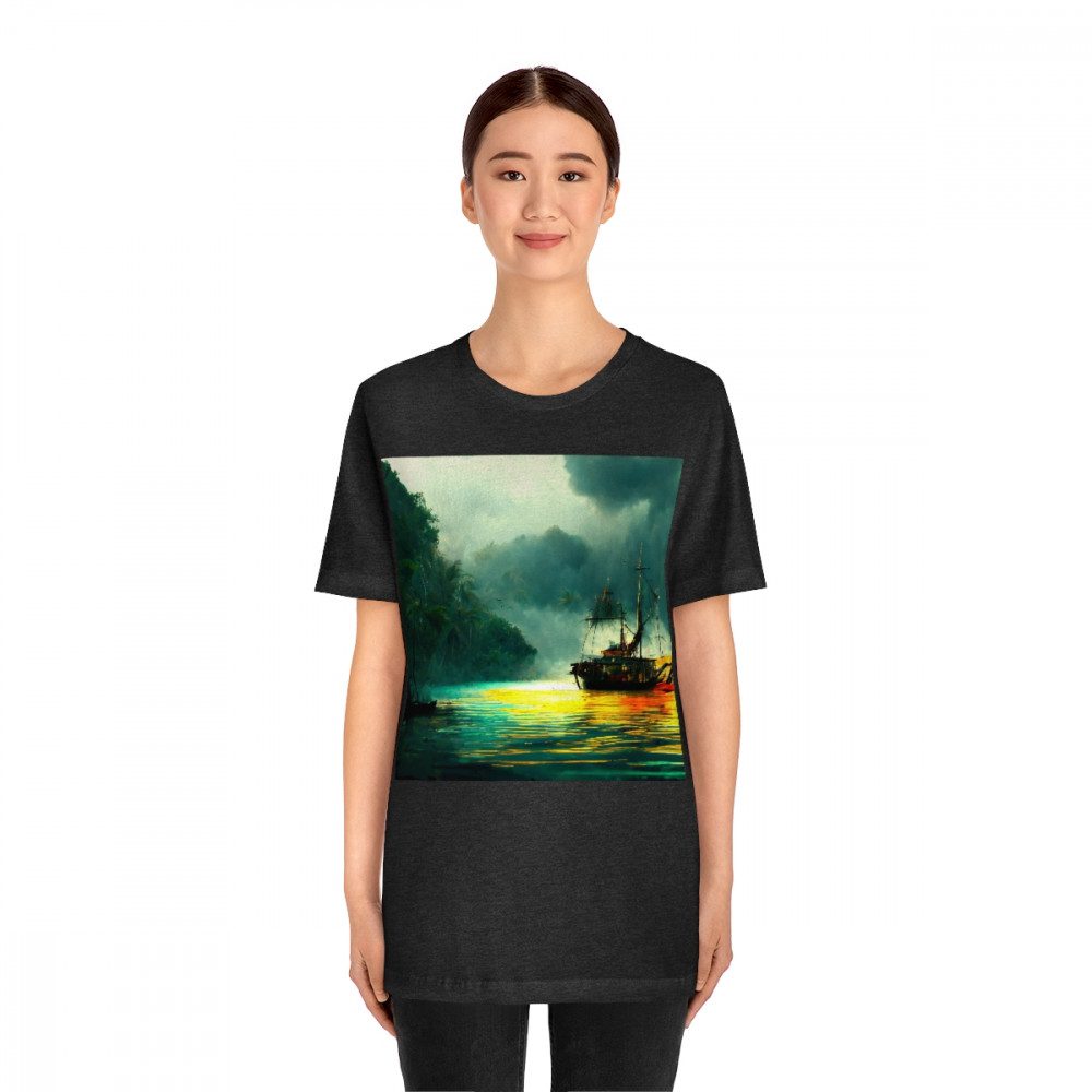 Wrecked Pirate Ship Sitting Tattered And Burned In The Bay With Dark Clouds At Sunset